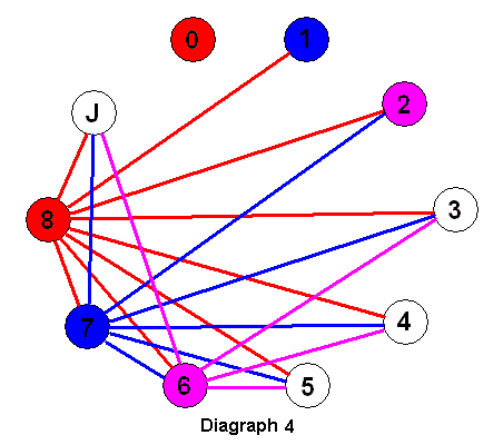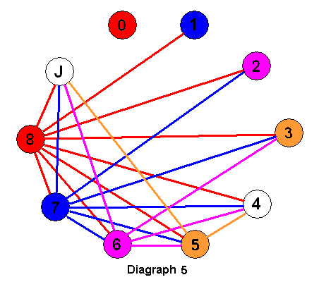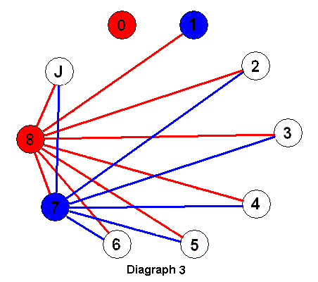 Here we can see that the shaking was (8, J), (8, 1), (8, 2), (8, 3), (8, 4), (8, 5), (8, 6), (8, 7). This leaves us with 8 and 0 who have not shaken hands, and this gives us our first couple. We now move onto 7. 7 has shaken with 8 already and will be able to shake a further 6 hands. 7 cannot shake with 1 as 8 has already done it and thereby used up 1's sole handshake
